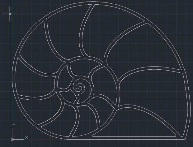 En primer lugar, me dibujó una espiral logarítmica y luego cortarlo en secciones regulares mientras consulta fotos de nautilus cáscaras para obtener las proporciones aproximadamente correcta. Cerca del centro de la espiral, las secciones de barren hacia fuera dos veces el ángulo porque no quería que los estantes del centro pequeñas. Yo entonces compensar la espiral 0,75 '' como un grueso de estantes que parecía adecuado.