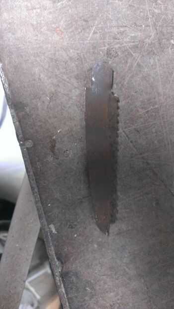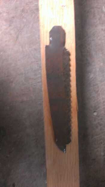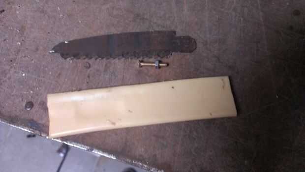 Para hacer que la hoja se puede utilizar cortador de metal de hormiga como hizo o hacerlo a la antigua manera por una sierra, de cualquier manera hacen una forma que te gusta y que se ajusta a en pedazo de pvc que hiciste anteriormente. Utilicé los dientes de mi hoja de sierra como la parte de atrás de mi cuchillo por lo que también puede actuar como una sierra cuando usted necesita para derribar un árbol por ejemplo.