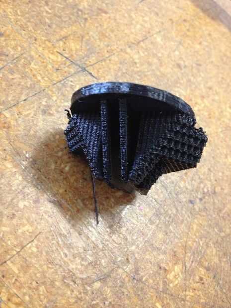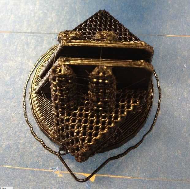 después de mucho ensayo y error aprendiendo a usar la impresora 3D de máquinas tipo A estoy imprimiendo mi primera pieza a dar como regalo. La pieza fue descargada thingiverse y es ayuda de cuchillo para ayudar al cortar objetos duros con un cuchillo de cocina. Esta impresión con un sólido fondo impreso bien y fue eliminada fácilmente desde la plataforma de impresión.