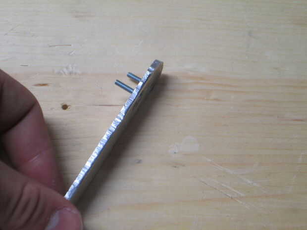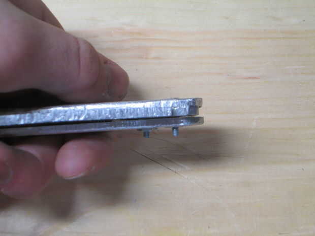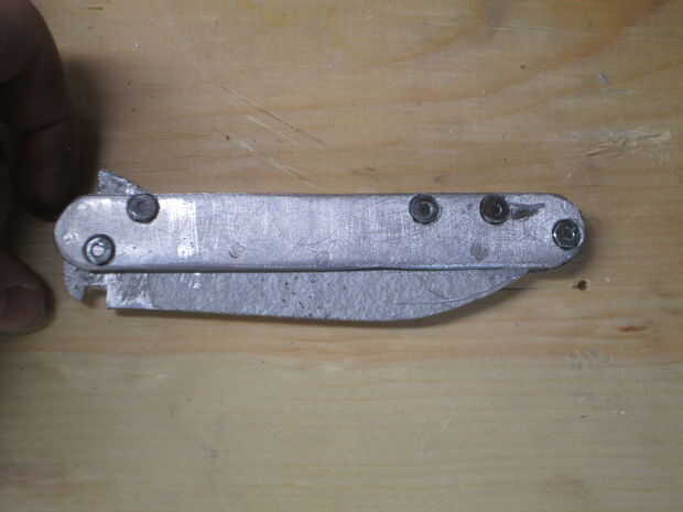 Para mantienen unida, usé algunos tornillos. Los tornillos que utilicé en particular fueron algunos tornillos número 4, que tomé hacia fuera debido a su longitud y su diámetro. Elegí donde necesita cada pieza y les afianzado con abrazadera juntos. Esto me permitió perforar todo el camino. Haciendo esto, he podido introducir los tornillos en el cuchillo y celebrar todos juntos. Sin embargo, esto significaba que el perno y la cabeza de esta Asamblea fue sobresalen. Como resultado, decidí en agujero por tomar una broca del diámetro de la cabeza y la perforación en el agujero que había perforado previamente. Me aseguré de no recorrer todo el camino, como mi objetivo era permitir el tornillo a hundirse en el agujero mientras todavía mantiene todo junto. Esto condujo a los hilos que sobresalen más de necesario, para que los corte con una herramienta giratoria.