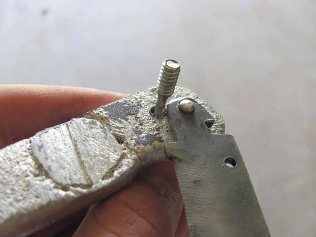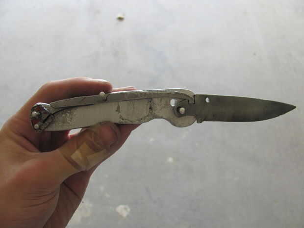 navaja de mango de cadena de bicicletauna lámina de cuchillo roto, sin uso y una cadena de bicicleta aceitoso nacido fuera del matrimonio...1.Es la parte inferior de la hoja con dos orificiosestaba equipado con el conector de cadena, martillado junto