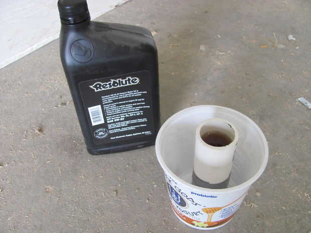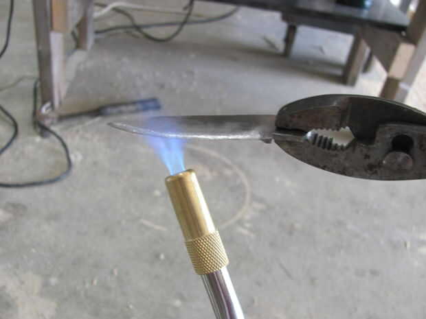 Para hacer este acero más dura y capaz de sostener una ventaja, tenemos que pasar por un proceso llamado Temple y revenido. Para ello, utilicé un soplete de propano (realmente utilicé gas de mapa) para calentar la hoja hasta que es de color naranja brillante y ya no es magnética. Entonces yo rápidamente hundió en algunos nuevos aceite de motor hasta que haya enfriado. Este rápido cambio de temperatura hace la hoja extremadamente dura, pero también muy frágil. Para hacer la hoja un poco más flexible, tenemos lo del genio. Puse la hoja en una hoja de galleta y ponerlo en el horno a 375 grados durante 2 horas y dejar enfriar con el horno. Cuando usted tira de él hacia fuera, tendrá un montón de grasa y escala en él, pero que se puede quitar fácilmente con un papel de lija.
