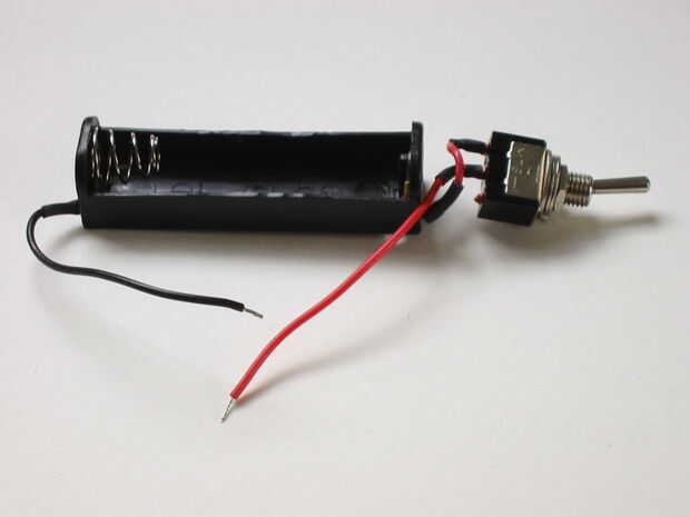 Deslice un trozo pequeño de encogimiento del calor de la tubería a lo largo del cable rojo del soporte de la batería. Empuje cuidadosamente en el orificio del soporte y del encogimiento en su lugar. Proporciona algún grado de protección para el cable. (Esta instrucción duplica la instrucción en la preparación del soporte de pilas). Deslice el otro trozo de tubo termo retráctil en el cable rojo. Corte y pele el alambre a la longitud y algunos soldadura se aplica a ambos el pin en el interruptor y el extremo del alambre. Suelde el cable rojo del soporte de la batería directamente a la patilla exterior del interruptor. Deslice la pieza de tubo termo retráctil sobre la articulación para proteger y para fortalecerlo.