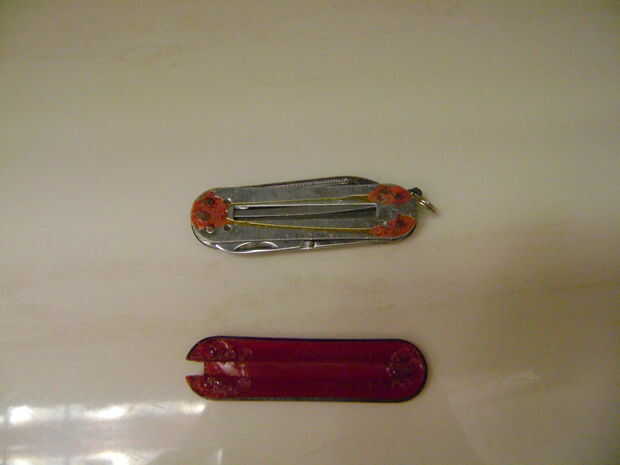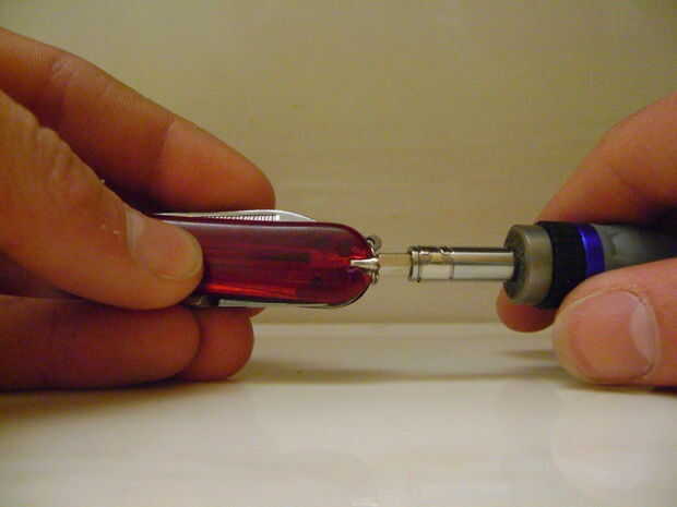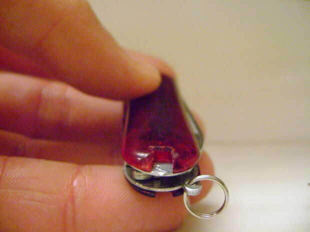 Luego, inserte un destornillador de cabeza plana en la apertura donde la pinza o diente pick va. (Se trata de la parte posterior del cuchillo). Cuidadosamente use el destornillador como palanca y empuje hacia abajo a su vez esto se "levante" el mango de la navaja.