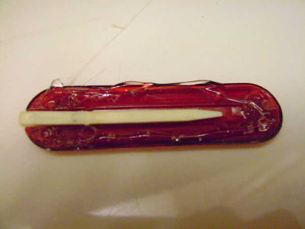 Ahora que han eliminado uno de los mangos de cuchillo, correr un poco de pegamento caliente a lo largo de los bordes de la manija y luego colóquelo en la unidad. Luego pegamento caliente su próxima manejar en el lado opuesto de la unidad. Este emparedado de la unidad entre las dos asas.