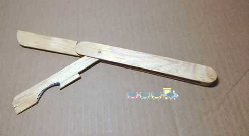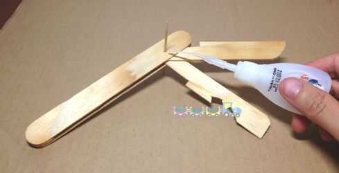Poner el palillo mondadientes a través de la cubierta 2, la hoja del cuchillo y abrebotellas. Pegar el palillo a la cubierta 2. Ten cuidado, no pegue el palillo de dientes para el cuchillo y el abridor. Luego corte la pieza del palillo de dientes.