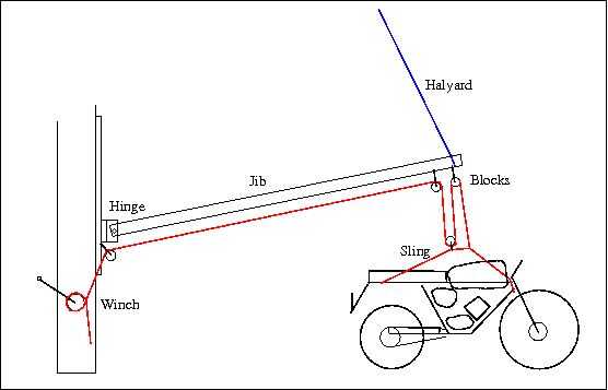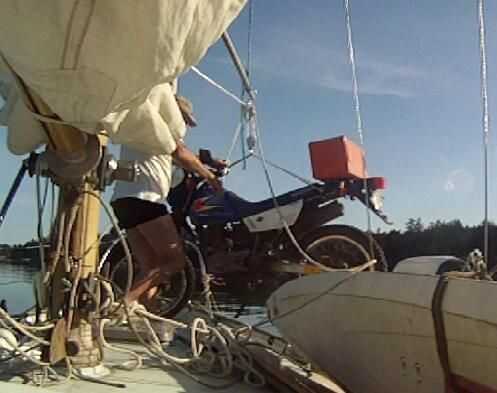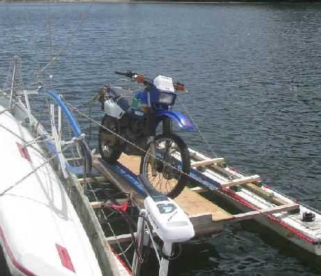 La motocicleta desde el velero el gato es un poco más complejo. Originalmente usé un tangón y un solo bloque (polea), con un winche de driza. No ofrece ninguna ventaja mecánica, así que tuve que tirar todo el peso de la motocicleta de 200 libras, y más tarde rompió el poste. Entonces hice una torre de perforación de un trozo de mástil aquacat (aluminio tubular) y una bisagra de acero. La bisagra se monta en un corredor de aluminio que se fija en la pista de poste del spinnaker en el mástil, apoyando el brazo de la torre de perforación que es libre de moverse en 2 ejes. El extremo de la pluma es apoyado por la driza de vela mayor. 2 cuadras a la horca proporcionan una ventaja mecánica de 3:1, la línea sobre el cabrestante de la driza por otro bloque. Hay un cabestrillo personalizado de 3 puntos para la moto que va en el marco de la dirección y se fija a las asas traseras. El catamarán está asegurado al lado de la proa de la embarcación. Conseguir la motocicleta en el gato es una cuestión de izado de la cubierta, moviendo el brazo de la torre de perforación sobre el catamarán y bajar así que aterriza en la plataforma de carga. Generalmente asegurar la moto al gato con una línea de un lado para que no se caiga de la pata de apoyo. Volviendo a bordo del velero es una cuestión de invertir el proceso.