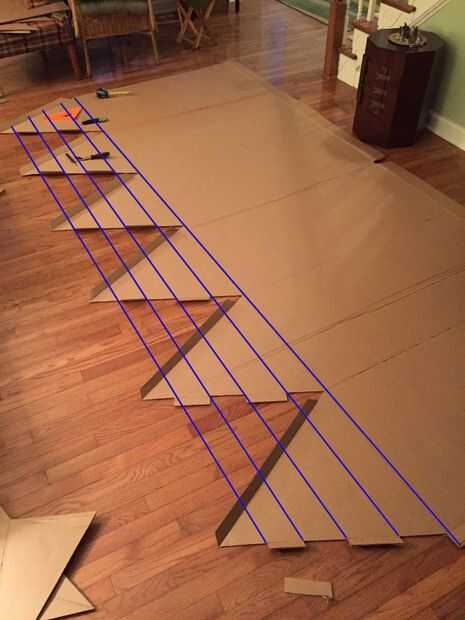 Dibuje cuatro líneas equi-distantes en donde dibujó las líneas para esbozar los triángulos del techo. Esto le dará a las pestañas y las líneas de corte de ranura de ficha. Para asegurar que no F esta parte hacia arriba (como lo hice casi), mark y "X" en la cartulina estará cortando lejos para que no corte una ficha. Puedes mirar la foto de arriba y ver cómo he dejado dos pestañas en el centro de los triángulos. Junto a las fichas en el otro lado de los triángulos, dibujar dos líneas cortas, gruesas para las líneas de corte de ranura de ficha.