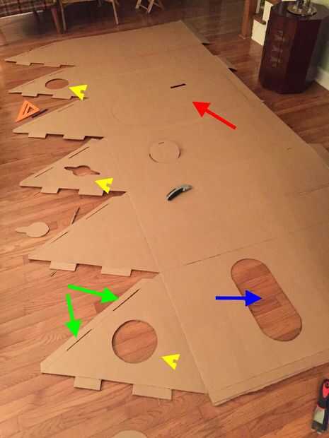 Observe la ficha recibir agujeros (verde) del paso anterior. Nota a sí mismo: Hace un poco más ancha que el espesor de la pestaña. Es un dolor en el culo para intentar volver a cortar el agujero más grande, sólo recorte poco de cartón (que aspira).