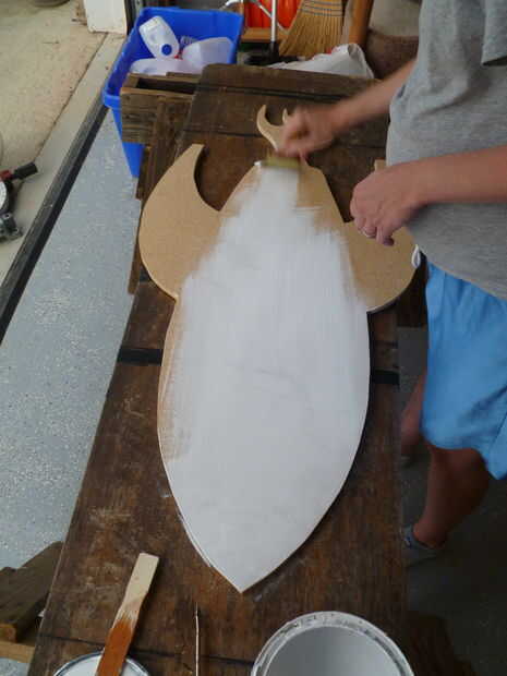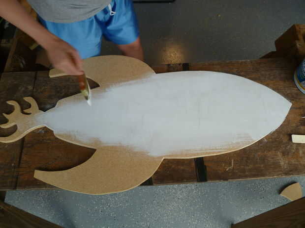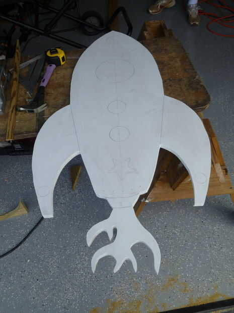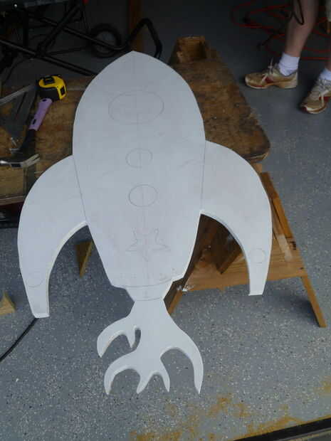 Entregó la pintura a mi esposa como tiene el instinto para el diseño. Había preparado el tablero y diseñado lo que queríamos el cohete para parecerse a. Tómese el tiempo para medir y centro de su diseño para que se vea bien. Este paso tomó más tiempo de lo previsto debido a la extraña forma del cohete. También, utilizar artículos de uso diario de alrededor de la casa para ayudar a diseñar el look (tazas para ronda de círculos, cortador de galletas estrella, etc..).
