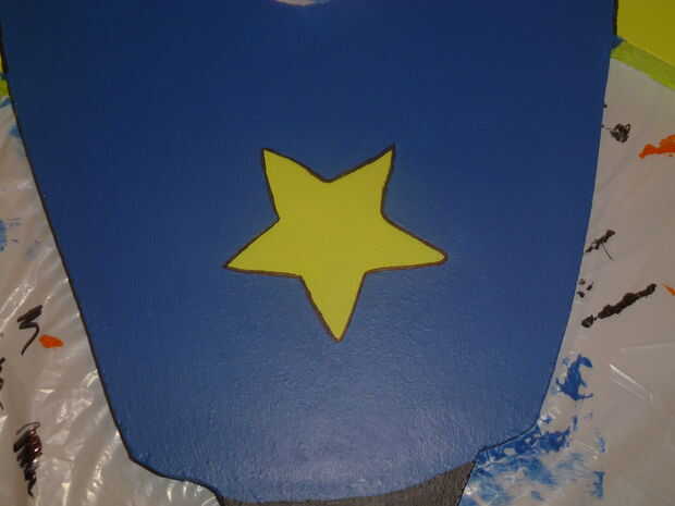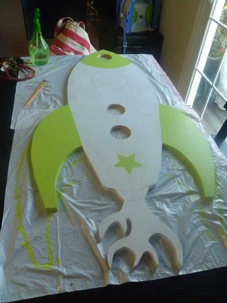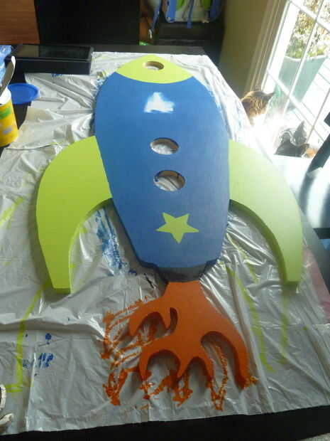 Mi esposa elegir los colores de cal verde y azul para pintar el cohete (esto era en parte porque éstos son los colores que teníamos puesta alrededor de la casa). Pintado de tres capas de cada uno de los colores en el cohete y lijar entre cada capa. Para hacer los diferentes colores "pop", delineamos el cohete entero con un marcador sharpie negro. El marcador le permitirá conseguir líneas nítidas, si tienes una mano inestable al pintar. Por último, hemos añadido 3 capas de brillo claro acabado de pintura en aerosol para proteger el cohete.
