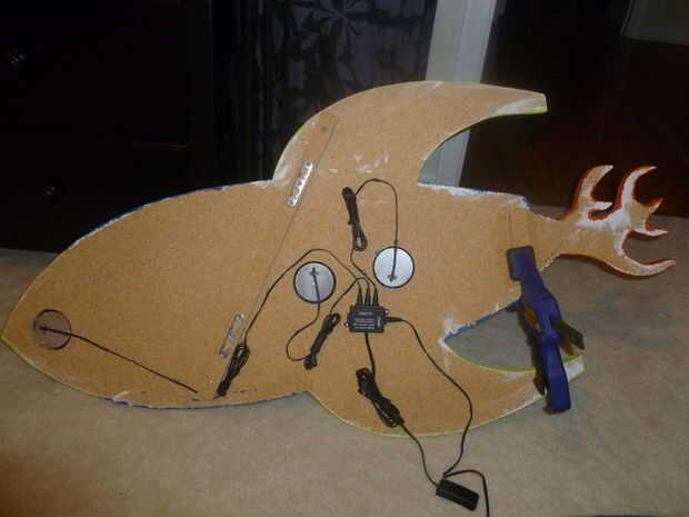 Inserta las luces y usa otra vez la pistola de pegamento caliente para asegurar los cordones en la parte trasera del cohete. He intentado hacer bien para que no acaba de convertirse en un gran nudo detrás allí con el tiempo también, pega una pieza gruesa de pulgadas de tablero de partículas de desecho con Tightbond III por el ángulo que quería colgar. Entonces añadí una segunda pieza en la parte inferior del cohete. Esto permitió que el cohete a colgar uniformemente como dar espacio a las cuerdas. Consejo: Asegúrese de no usar tornillos que son demasiado largo... esto fue una llamada de cerrar para nosotros. También, asegúrese de pretaladrar los agujeros de sus tornillos se empuje el material hacia adelante y hacer un bulto en el lado acabado.