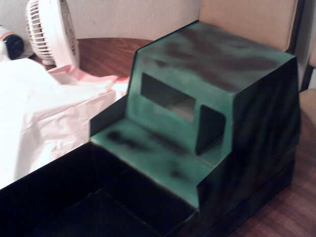 Utilizando simplemente una caja de cartón, cartulina, pintura en aerosol blanco barata, brillo negro y plata tarjeta stock de papel, un sombrero de fiesta plata holograma, un tapón de jabón de lavandería, una pistola de pegamento y algunos artículos