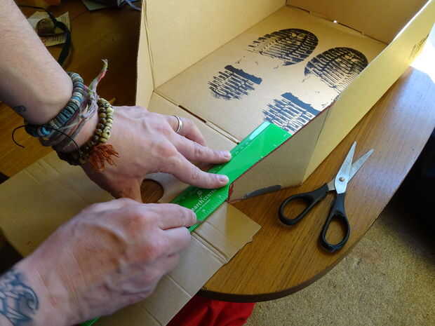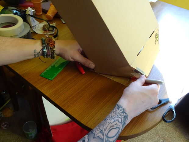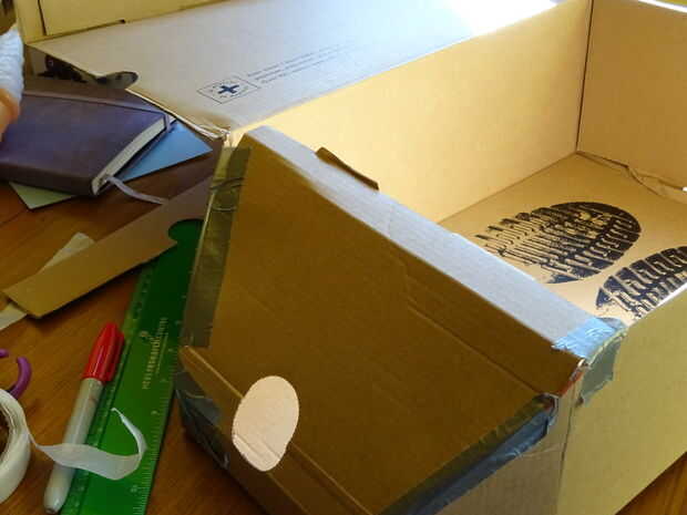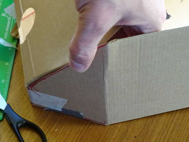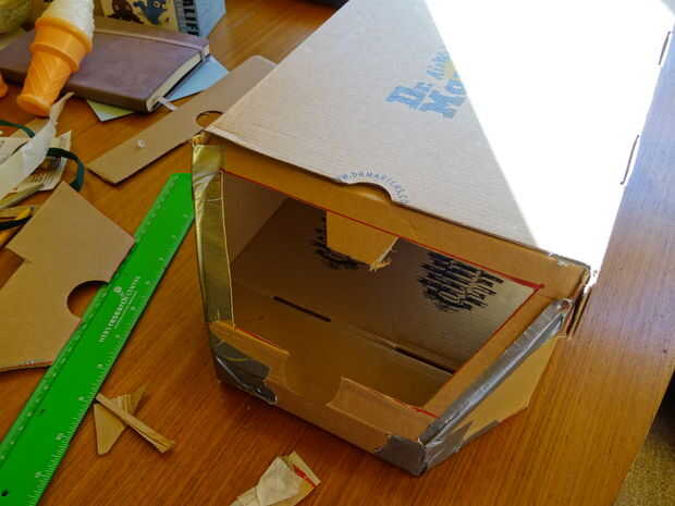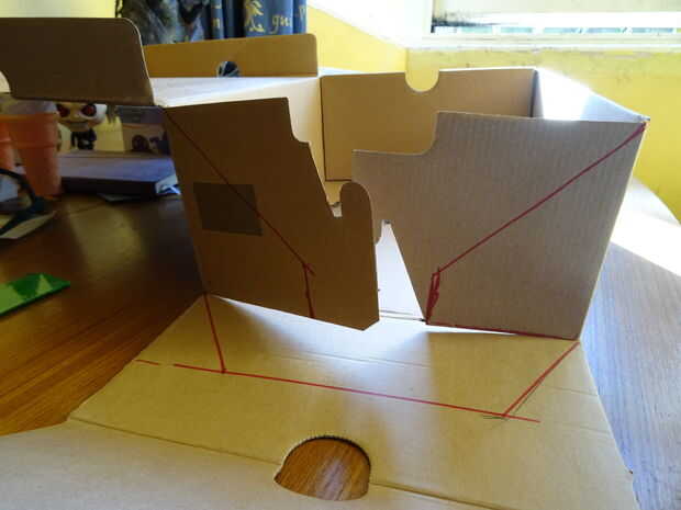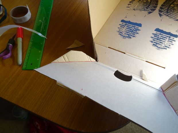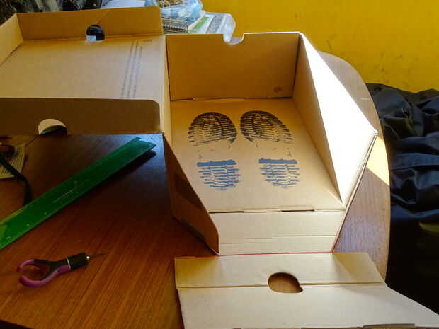 hice este horno solar de la nada, pero:una caja de zapatos (con la tapa puesta, no removavel),una camisa de invierno vieja,una bolsa de plástico,papel negro,dos lápices,y papel de aluminio.Paso 1: la tapa Corte la tapa como la imagen.Paso 2: el "cris
