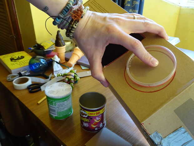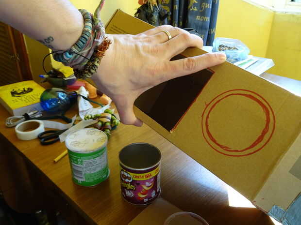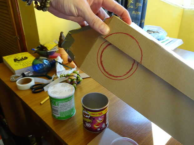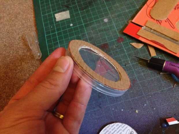 En otro pedazo de cartón dibujar alrededor de las tapas otra vez y una vez más, hacer un círculo más pequeño dentro. recorta este aro y colocar en la tapa y Coloque estos sobre los orificios de la ventana. Si vas a lo de que desea mantener los círculos más pequeños para usar como máscaras pintura de aerosol