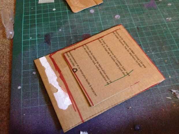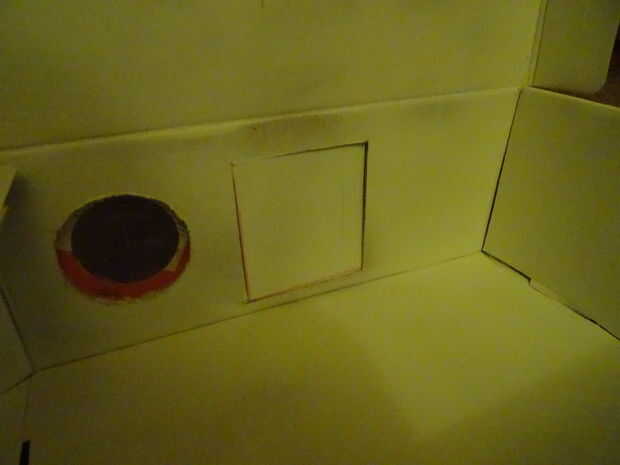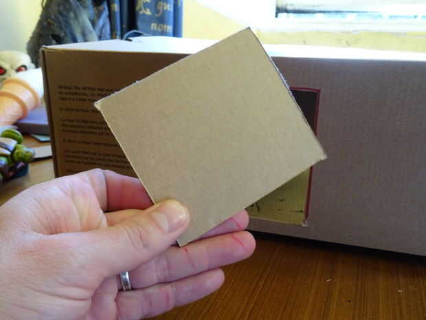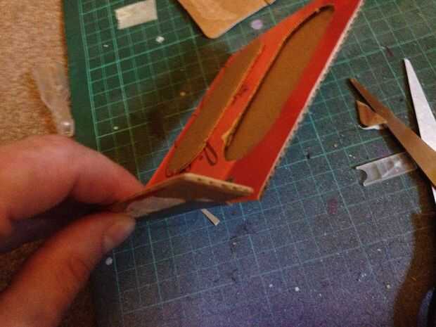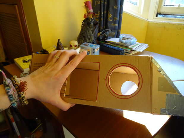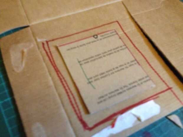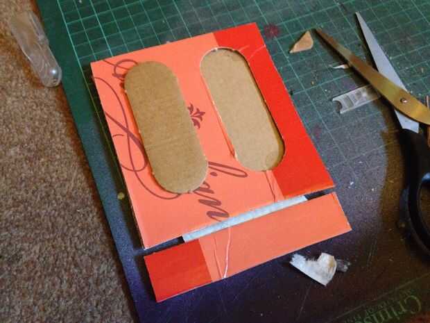 Otro pedazo de cartulina y un cuadrado más grande. se trata de la parte exterior de la puerta. Usé la sección de la manija de una caja de vino para conseguir ese look (foto). Coloque la sección más pequeña. la sección más pequeña cabe en la brecha que mantiene la puerta en su lugar. para hacer la bisagra al corte un rectángulo pequeño el mismo ancho que la puerta exterior, deje un pequeño espacio y unen poniendo cinta en ambos lados.