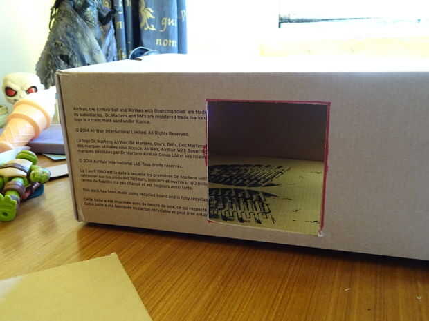 Utilice su juguete para marcar hacia fuera una puerta lo suficientemente grande. lo he hecho en el lado que no tiene la tapa para que no interfiera con la apertura y cierre de la puerta.