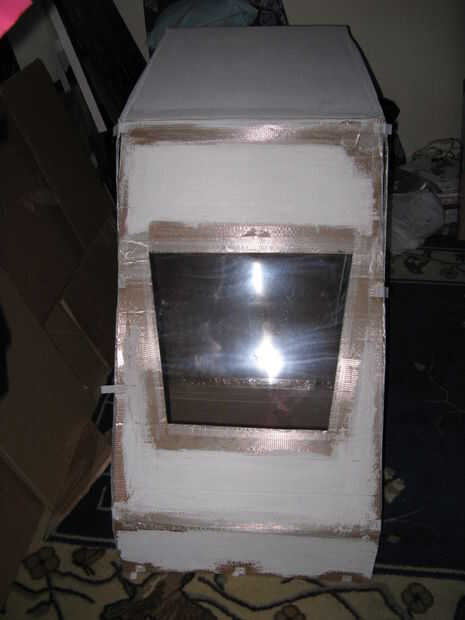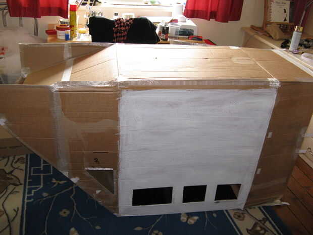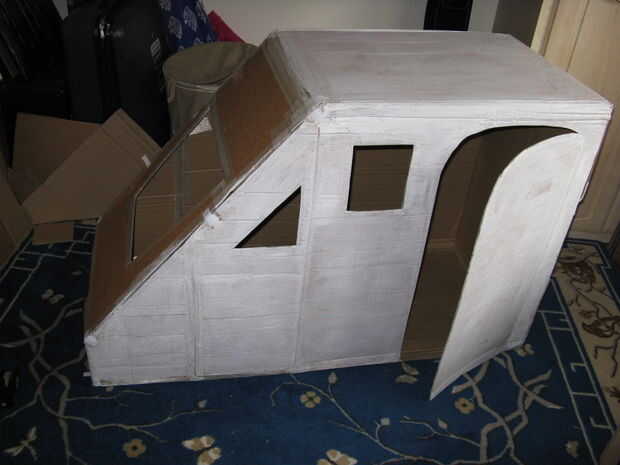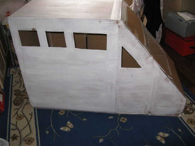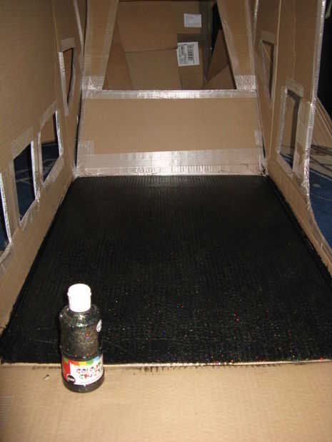 He cortado 3 ventanas más en el otro lado y poner más pedacitos de velcro a los lados. Empieza a pintar el exterior con blanco acrílico gesso y témpera blanca - como que es lo que tenía en casa :-) (tomó cerca de 4 capas para cubrir la caja marrón sin embargo). He comprado 2 hojas de acetato de A3 y ponerlos junto con una tira de cinta adhesiva transparente. Esto fue cortado a la medida y atado con una pistola de pegamento como la ventana delantera. He invertido la nave espacial y pinta el techo con pintura de acrílico negro y luego con pintura negra brillo.