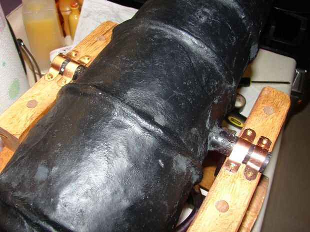 Más cobre abrazaderas fueron modificados para crear un eje bastante apretado para evitar que la boca del cañón caigan abajo - ya que es un poco más pesado en la parte delantera. Utilicé tornillos de latón para mantener las cosas buscando agradable. También, taladré un agujero en cada barra de pivote para aceptar un clavo de 10 centavo para impedir el desplazamiento de izquierda a derecha el cañón. Usted puede ver la cabeza del clavo al lado de la correa interior - es pintada de negro también.