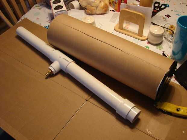 comencé por prueba de montaje de los componentes originales del cañón barril PVC schedule 40. El tubo de cartón es el empaque de una lámpara de Lava. Las bolas de cañón son pelotas de golf de práctica de espuma amarilla de la tienda por departamentos local. Tomé una a la tienda y encontró que cabe perfectamente dentro de un tubo de PVC de 1.5". La ' t ' guarnición tiene una 1" pierna que encajo un reductor adicional en él que aceptó el latón moleteado para el tubo de suministro de aire de goma.