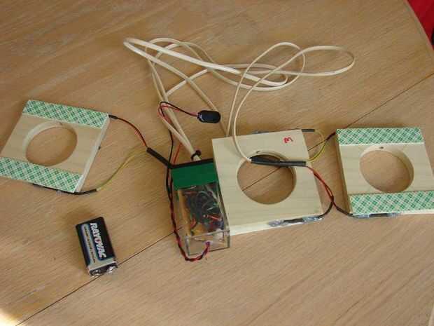 Hermano de un compañero construyó un circuito electrónico con tres vigas de sensor a colocar en el casco del barco. Cuando una bola rompe el haz de la unidad emite un sonido de explosión que se entrega a través de un par de altavoces de la computadora. Esto fue un toque impresionante!