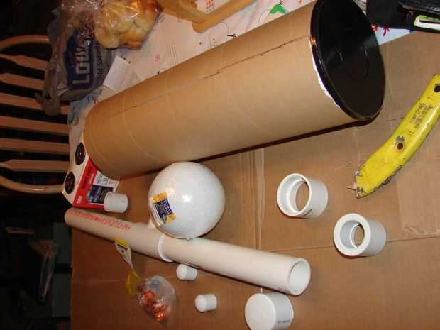 Muestra la bola de espuma de poliestireno (que se reducirá a la mitad) y la tapa de PVC que se utilizará para la culata del cañón. También muestra los cortes en el tubo de cartón. Hay uno en cada lado, 180 grados, que van de un extremo a cerca de tres pulgadas de la otra. Esto permitirá una superposición para que el cañón tendrá su forma cónica. También hay algunos varios otros pedazos de PVC que se utilizará para adaptar el latón ferruled guarnición.