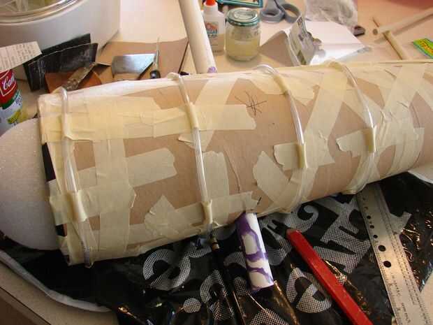 he utilizado cinta adhesiva para sujetar algún tubo de goma de diámetro pequeño para formar algún detalle refuerzo de cumbrera. El embalaje original para la lámpara de lava tenía algunos guardianes de espuma de poliestireno que cortar un agujero y pegado dentro del tubo de cartón para guardar el tubo de PVC centrado. El casquillo de extremo plástico negro fue entonces puesta en, la bola de espuma de poliestireno se corta por la mitad y fue aburrido un agujero en el centro por lo que encajaría en la porción que sobresale del tubo de PVC.