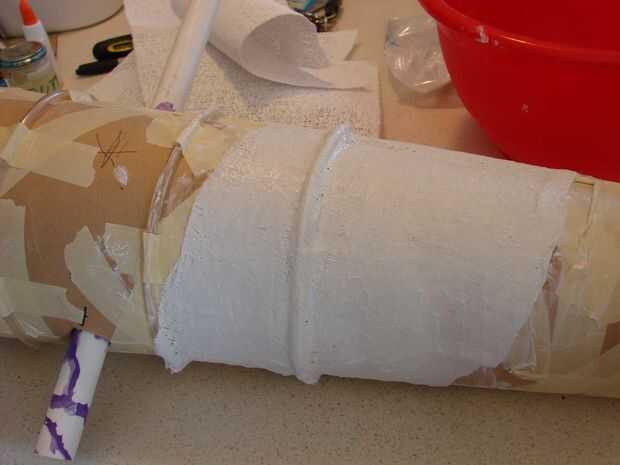 Aquí está la primera pieza de tela de yeso (como envoltura rígida, encontrados en tiendas de suministros de arte más) envueltos en el cañón. Tuvo algunos trabajos para conseguir apretado a lo largo de los bordes de la goma de la tubería para que no protruyan. Luego trabajé el revoque liso. Cada pieza fue superpuesto en diferentes direcciones. Me aseguré de suavizar las cosas para que el patrón de la tela no se presentaron a través de demasiado.