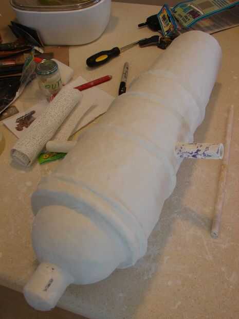 El cañón completamente cubierto y alisado hacia fuera. Observe el extremo de la culata con la tapa de PVC que sobresalen. Esto es donde los niños mantendrá el cañón al apuntarlo. Esta manera toda la presión es transferida a través de la PVC un no en la tela cartón o yeso. Una vez que esté completamente seca, fue pintada con spray negro semibrillante.