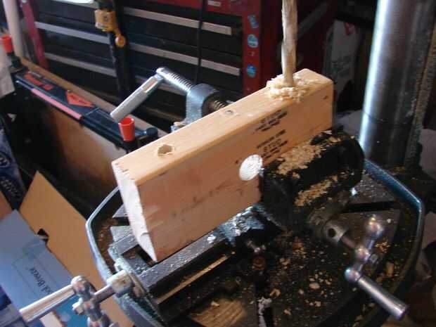 Una longitud de 8" de 2 x 4 fue utilizado para la silla de montar en el carro. Un orificio de 1" estaba aburrido en el centro. Se perforaron dos agujeros de 3/8 como se muestra en la imagen. La pieza se corta longitudinalmente a través del agujero del centro. Los orificios de 3/8 se utilizará para sujetar las piezas de carro con espigas y pegamento de madera.