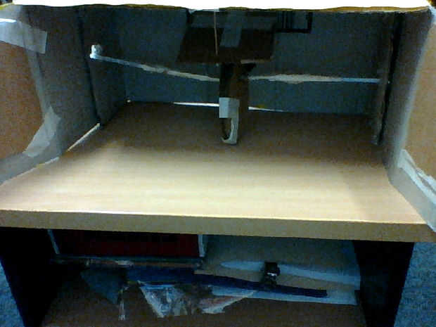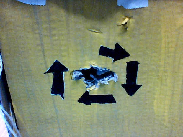 3 º, cortamos 2 agujeros uno en cada lado de la caja. Ponemos la percha a través de los agujeros. Entonces nos pegamos las piezas rectangulares de cartón en la percha para hacer la barra más larga. Cortar una pieza en forma cuadrada de cartón y había pegado a la caja un poco por encima de las levas. Esto hace que la persona que practica surf mover arriba y abajo.