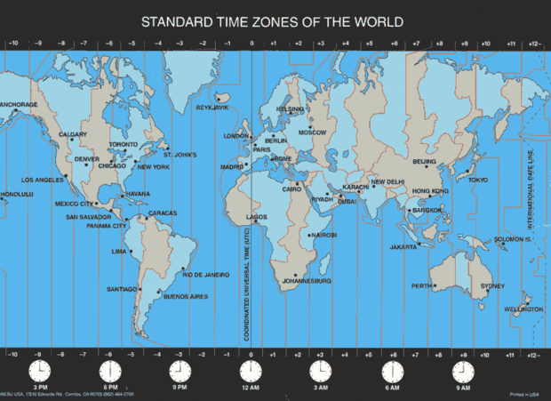 Esta tasa constante es donde tenemos nuestras zonas horarias de. La razón es que se define el mediodía como el período cuando el sol está en un perfecto ángulo recto con la tierra, es decir, directamente sobre nosotros. Sin embargo, qué es mediodía de un lado del mundo no es lo mismo para el otro lado. Por lo tanto, a fin de cuenta para esto, la tierra fue dividida en 24 zonas horarias. Por lo que podría haber alguna norma por la que todos en la tierra podrían decir vivían bajo.
