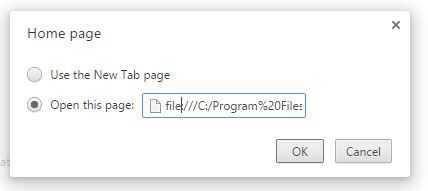No olvide incluir la dirección de carpeta (C:/archivos de programa (x86)/Google/Chrome/aplicación /) y el nombre del archivo (search.html).