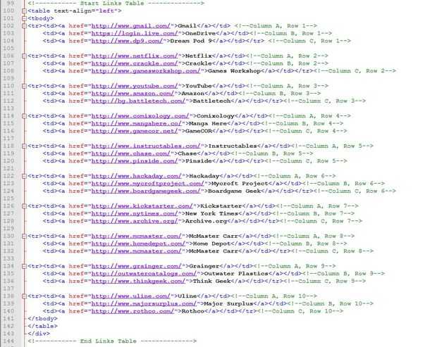Si no estás familiarizado con HTML, entonces usted verá mucho un texto extraño. No ser intimidados. Desplácese hacia abajo hasta la línea 99. Habrá una nota (<!--Inicio enlaces tabla-->) para modificar un enlace, simplemente cambiar el texto (morado en la imagen) a tu enlace preferido y cambiar la descripción a su lado (negro en la imagen). Para facilidad de uso, he organizado todos los eslabones en columnas y filas. Hay una nota después de cada enlace en cuanto a su ubicación de fila y columna.