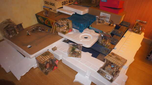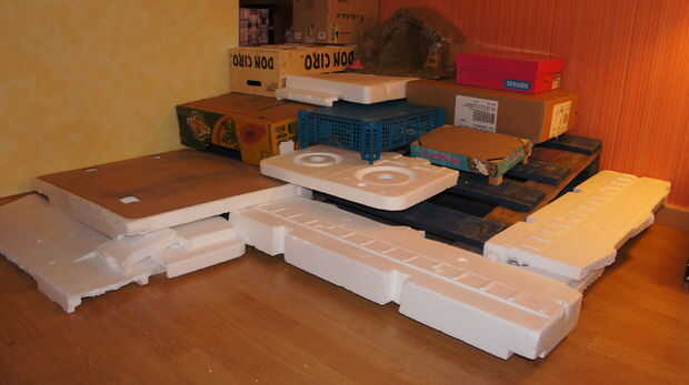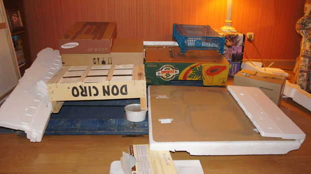 Hemos parado en unos contenedores de basura y recoger unas cajas de madera de fruta, cajas de cartón y styrofoams.