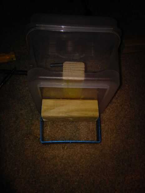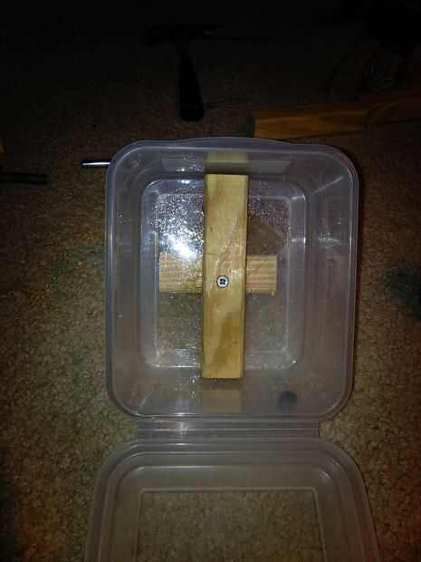 Cortar una pieza que encaja en el contenedor para montar el proyector. Taladre los agujeros para ataduras de cremallera. Tornillo para el montaje de la parte superior como se muestra.