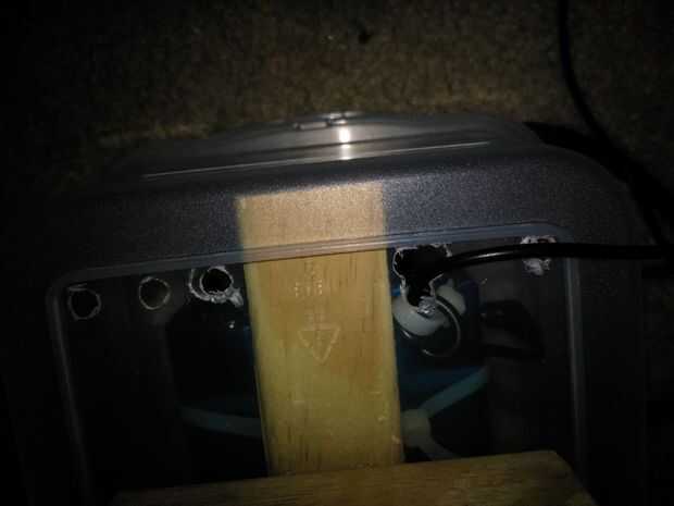 Perfore agujeros en la parte inferior para el adaptador de ventilación y de la energía. Les hice en la espalda porque estas cosas se estar inclinado hacia arriba. Si agua sucede dentro, debe drenar.