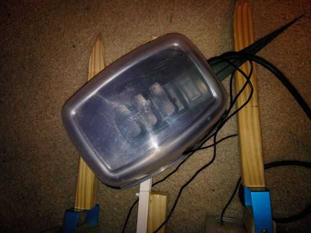 Tenía una potencia al aire libre de la tira con una estaca. Corte un orificio en un recipiente de plástico para los tacos y el juego.