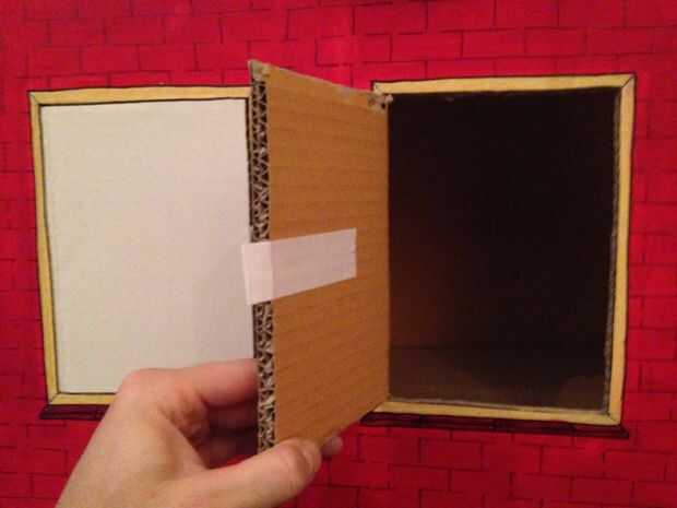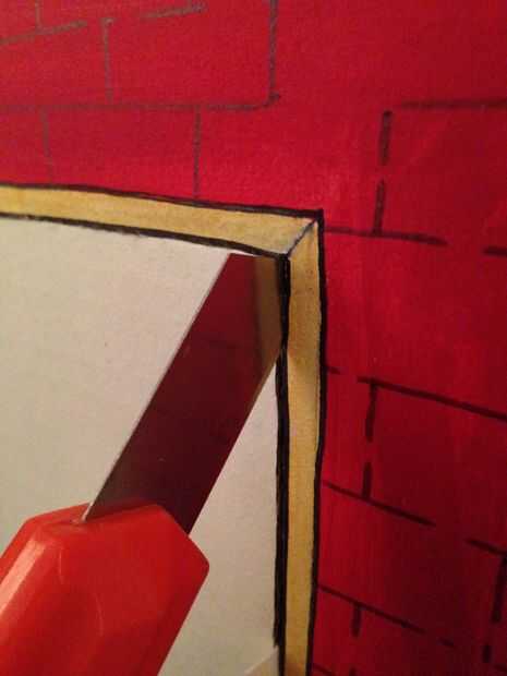 Cuando termines la caja de pintura empezarás a cortar las puertas. Utilicé las líneas de marcador de magia negra en el interior de los trazos amarillos de los marcos de la ventana para guiar mi corte. Utilice un bisturí afilado y puede que tenga que cambiar la hoja a lo largo del camino. Es más fácil hacer esto mientras que el cuadro se establece.