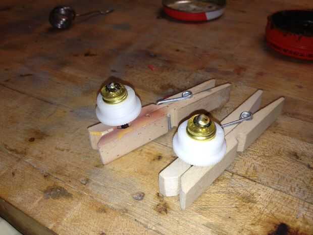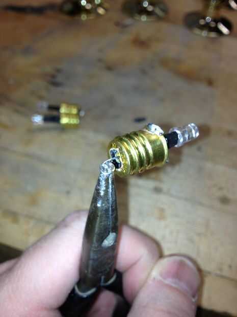 Hilo base nuevamente dentro del anillo de vela y voltee para añadir un poco de epoxi para sostener el punto de contacto positivo centrado y de cortocircuitar a la base. Ser muy cuidado de no conseguir epoxi en los lados de la base o no permite continuidad a ocurrir.