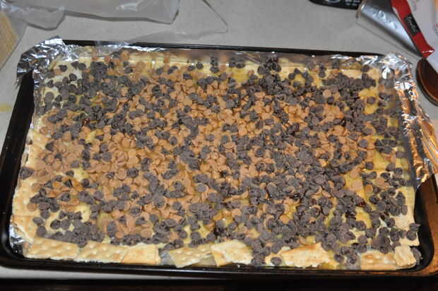 Sabe mejor si pones los chips de mantequilla de maní en primer lugar, luego los trocitos de chocolate, es aceptable si el chocolate y virutas de PB no cubren todo, porque se derriten.