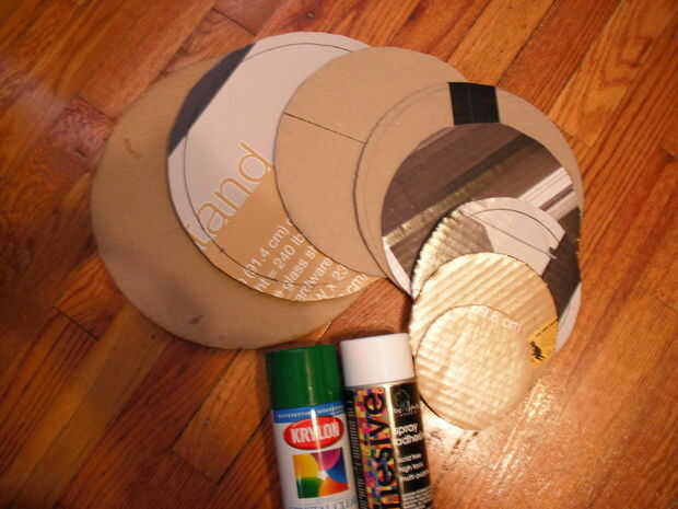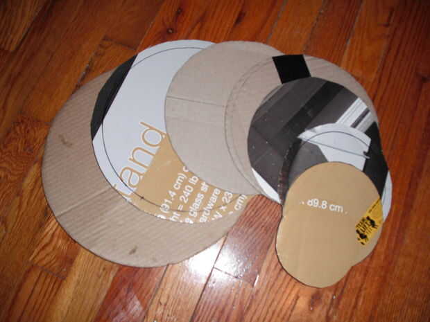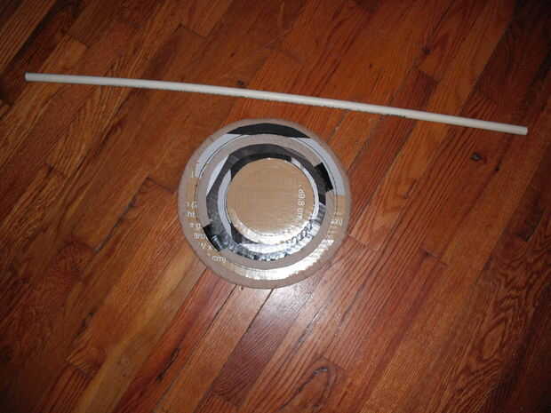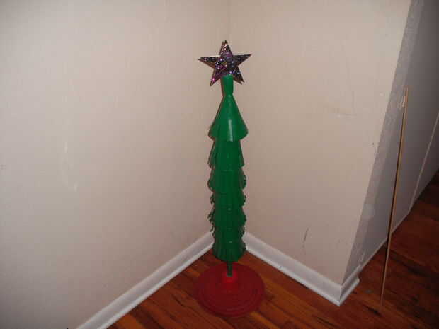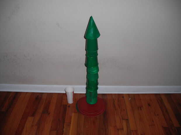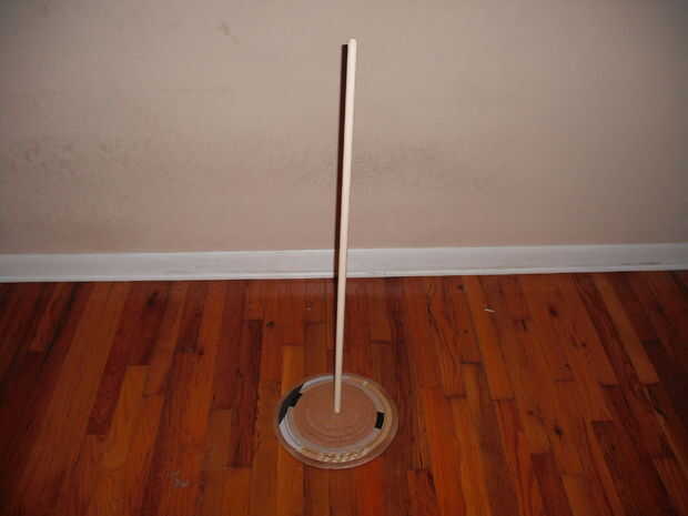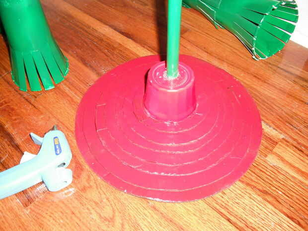 Lo primero que se debe construir es una base para el árbol. Mina construido con diversos círculos de tamaño de cartulina, cada una 1/2 pulgadas más pequeño que el anterior. Comencé en 10" y funcionó hasta alrededor de 5 pulgadas. Esto le ayudará a dar peso a la base y hacer el árbol poco probable que vuelque. Corrió a 3' pedazo sobrante de CPVC para arriba. Eventualmente tuve que agregar un apoyo adicional a la base de una taza de plástico metro y usa una pistola de pegamento caliente para fijarlo. Esto mantiene el árbol recto en lugar de inclinada a un lado. Iba a pintar todo verde, pero en el último minuto llamado un audible y aerosol pintado rojo en su lugar.