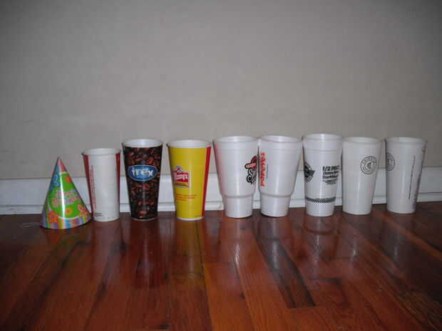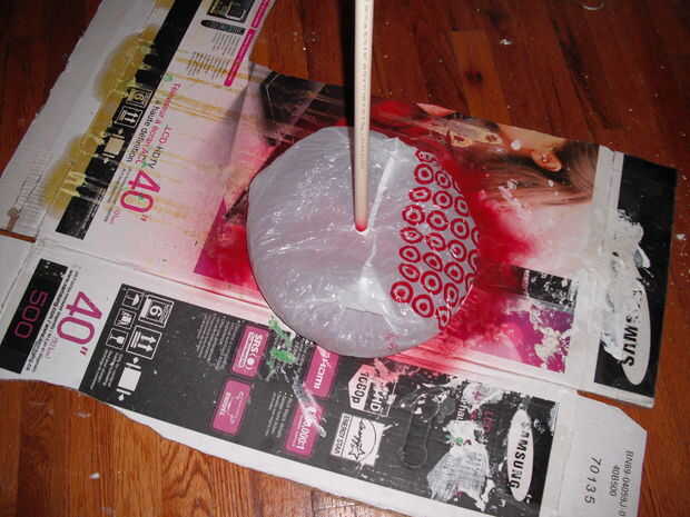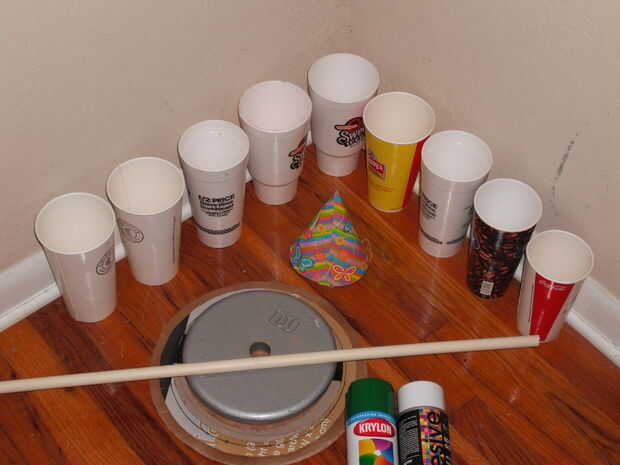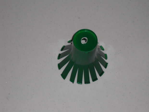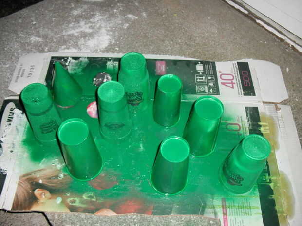 Luego pinté las copas verdes, tanto dentro como fuera. Una vez seco, hice un montón de cortes verticales en cada uno. Al principio, fue marcado, pero luego empezamos a cortar a través de conjeturas. Realmente no puedo decir que era que después del hecho, por lo es probablemente más fácil. Luego hizo un agujero en la base de cada uno y había pegado al centro de CPVC. En la parte superior es un viejo sombrero del partido, que recibió el mismo tratamiento. Para doblar las ramas hacia fuera ligeramente, palillo a la próxima Copa dentro y moverlo suavemente. No quieres ir demasiado lejos, o terminaras con difíciles curvas en lugar de genltly inclinados hacia fuera. Después todos junto, dan los miembros otra rápida capa de pintura verde.