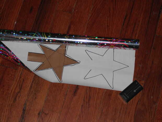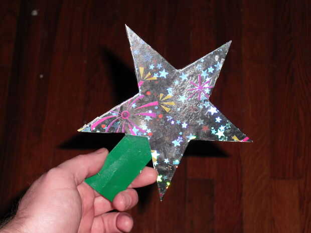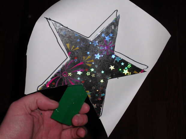 A continuación, usé papel de embalaje olográfico, con un par de trozos un poco más grandes que la estrella. Cortar la parte inferior de las estrellas y solía hasta y luego pegar el papel de embalaje de la cartulina. Cuando usted corta el papel hasta el tamaño de la estrella, debe salir sin poder ver el blanco del papel de embalaje. Probar en el árbol y fascinado por cómo la luz se ve como esta especie de intermitente al caminar por.