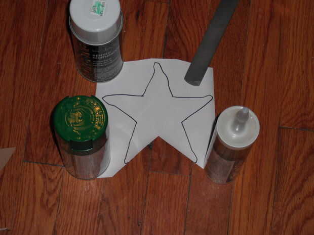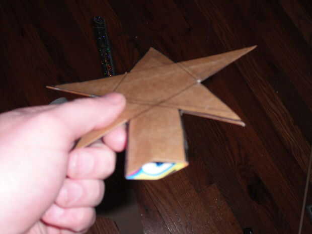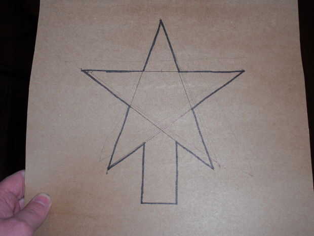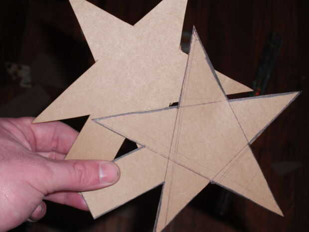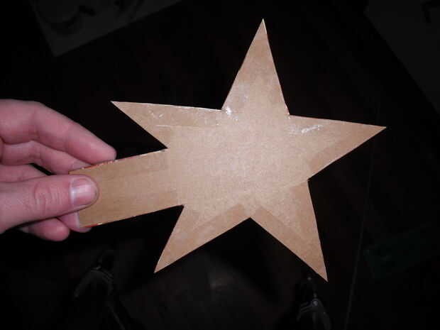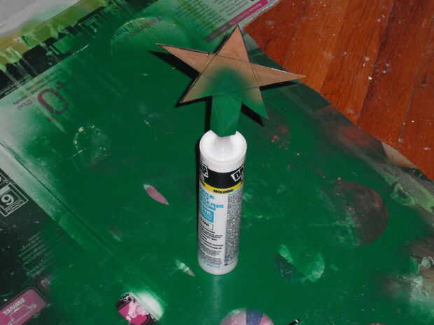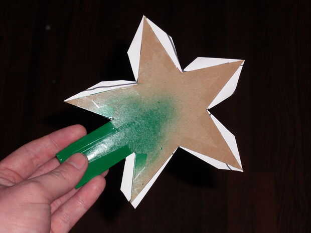 Empieza por tomar dos piezas delgadas de cartón. Marcar una estrella y luego marque una sección en la parte inferior que irá en la parte superior del árbol. Si usted es cuidadoso, puede utilizar la una sola pieza marcada para cortar dos piezas al mismo tiempo. Que tenga que hacer un pequeño recorte para emparejar para arriba exactamente si haces esto o no. La parte que no va a ser cubierto por la estrella puede ser pintada de verde, o simplemente usé un marcador mágico verde a color en el trabajo. Después de eso, yo con cinta los bordes de la estrella para que no vengan aparte cuando se pone en el árbol.