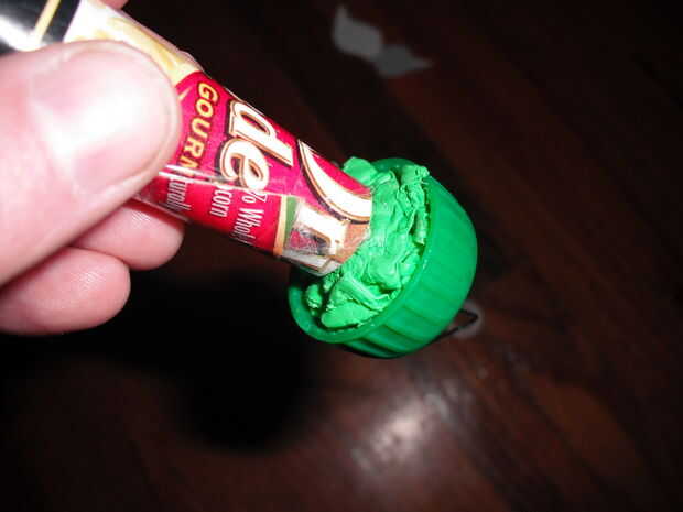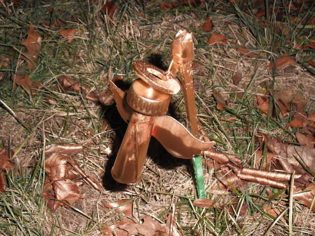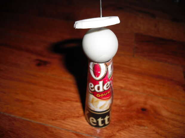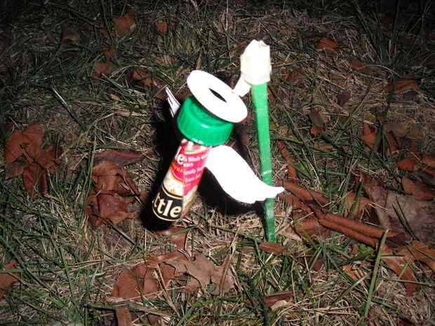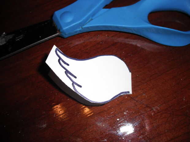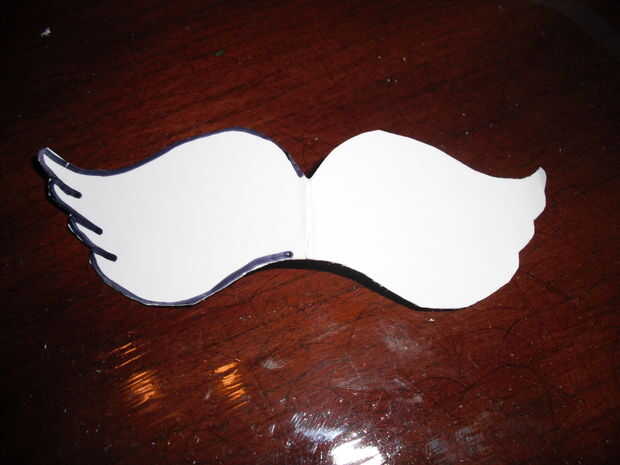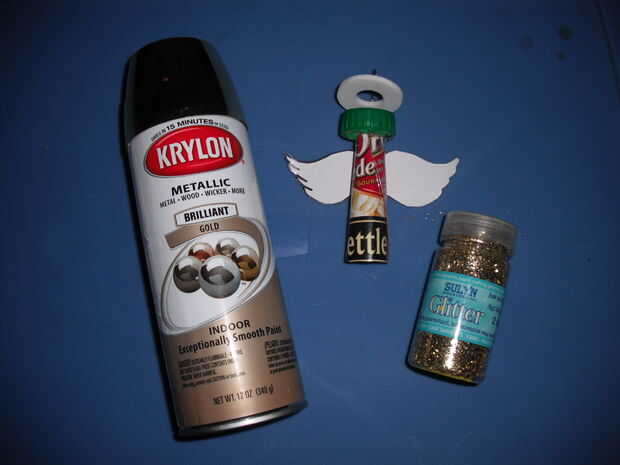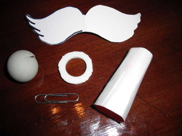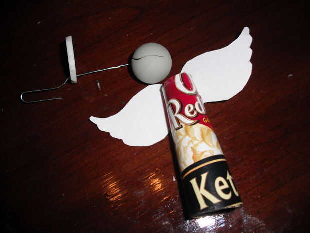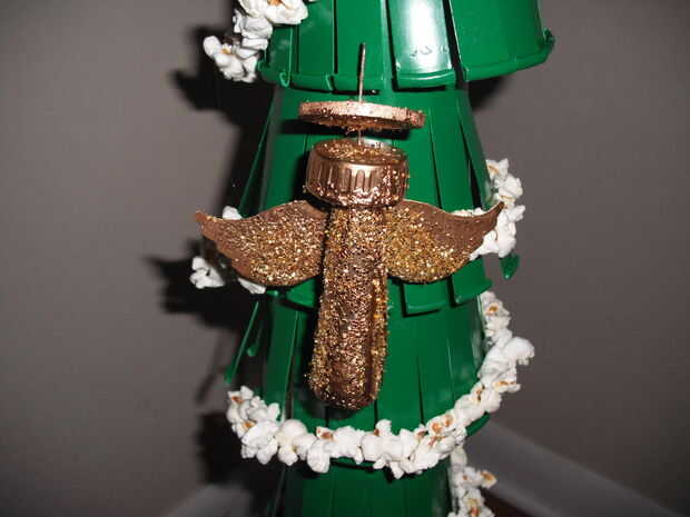Las alas fueron hechas simplemente de un cartón delgado, dibujé una ala, doblado por la mitad y cortar ambos lados para lograr conformidad. Yo rodé algún cartón más delgado en la mitad del cuerpo (la caja de palomitas de maíz sobrantes que utilicé para hacer la guirnalda) y luego utiliza tijeras para cortar las bases incluso. Me perforó un pequeño orificio en la tapa de la botella para el clip de papel y había pegado todo junto. El halo es el relleno de la parte superior de un tubo de DVD. Había perforado con el clip de papel, había movido en su lugar y había pegado al cuerpo.