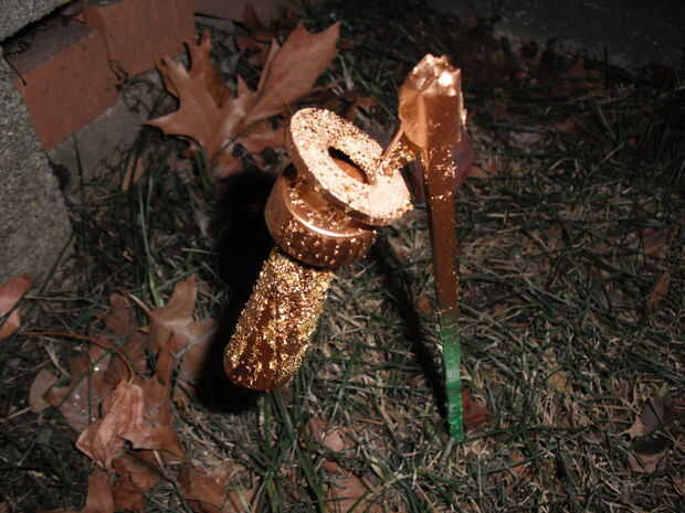 A continuación, utiliza un pequeño trozo de cinta para cubrir el sujetapapeles y probé la pintura metálica del oro de Krylon. Esta pegado a un palo y me pegó en mi patio por lo que pude pintar todos los lados de la misma a la vez. También mantuvo algunos brillo práctico y había rociada en la pintura mientras que estaba todavía húmedo. Enseguida descubrí que tienes que ir rápido-la pintura se seca muy rápidamente. Una capa fresca, algunos salpicados de brillo, y terminé. Algún pegamento de aerosol más tarde ayudará a mantener el brillo de caerse también.