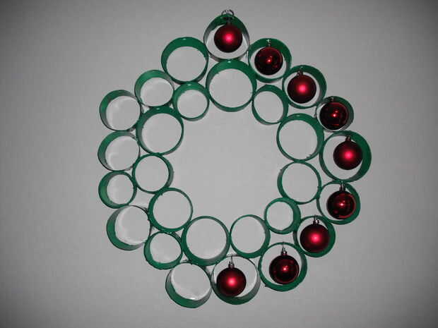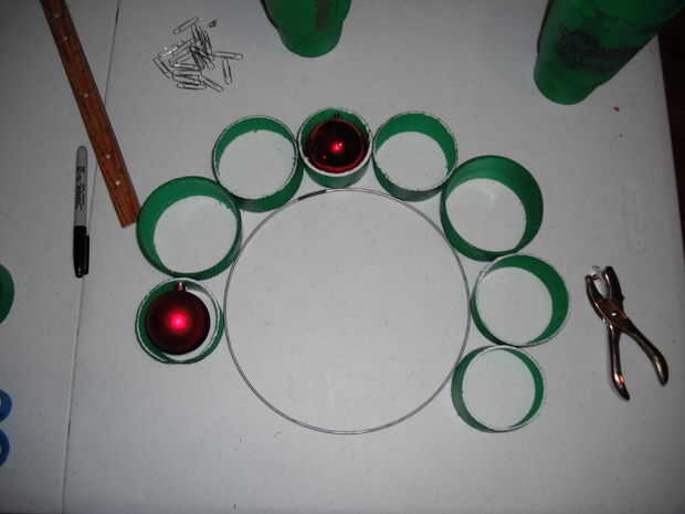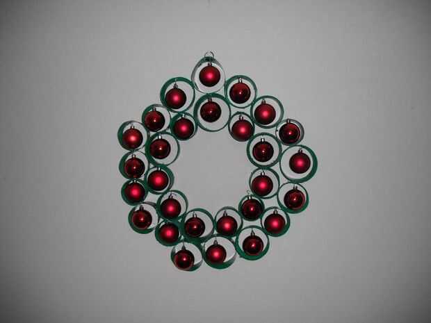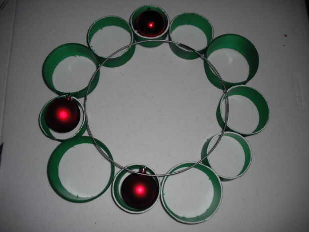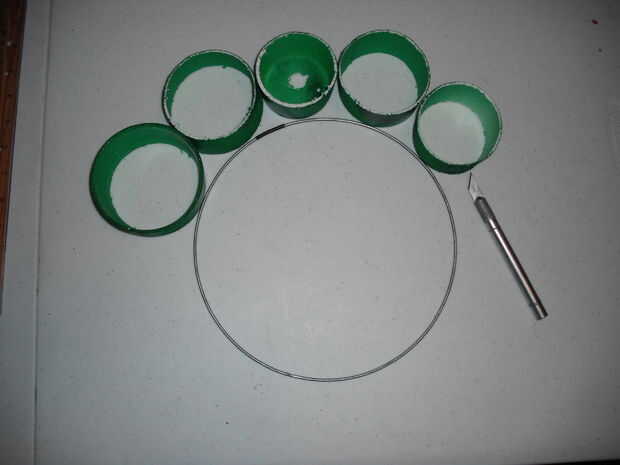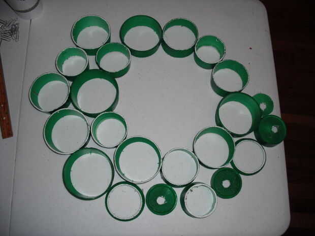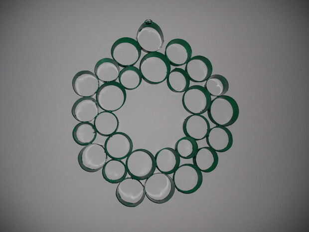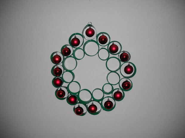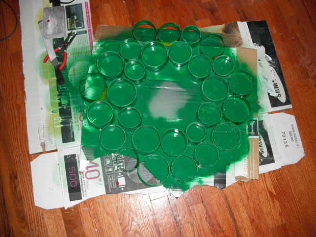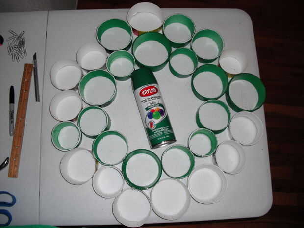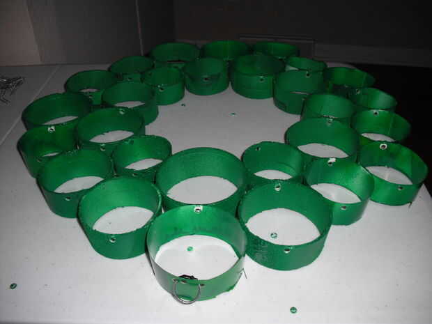 Una vez todas las tazas, usé algunos pintura verde esmeralda de Krylon y dio todo un buen recubrimiento. Es difícil llegar a todas partes con todos los ángulos que están en su lugar. Si Pinto el frente y atrás, se debe coger casi todo. Terminé perdiendo un par de lugares, pero los adornos cubren mucho las imperfecciones demasiado. Entonces había perforado abertura en la parte superior de cada círculo. Con un punzón de clips de papel, cortarlas y doblarlas para colgar el ornamento con. He intentado cada ornamento en los agujeros del centro, pero eso es mucho más difícil de lo que suena. Tomé un pedazo de alambre galvanizado y doblado en un círculo pequeño para colgar la corona toda. Unos días más tarde, me di cuenta que el oro de mi ornamento de Navidad Robot puede lucir tan bien en el medio. Compruebe la imagen principal de este instructable para el nuevo look!