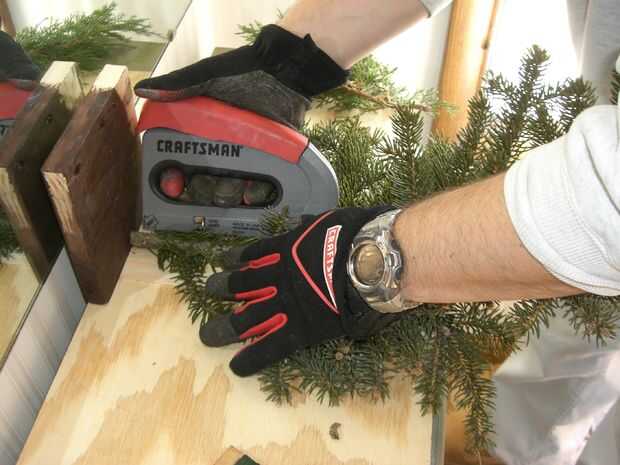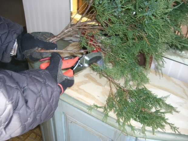 Añadir piñas, acebo inglés, cinta, decoraciones de la Navidad a tu gusto.