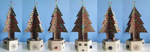 Una vez que tenga la forma del árbol y la base, usted puede soldar juntos. El suministro de las líneas que controlan los LEDs y el micrófono y el ATMega328 también son soldados de la base del árbol en la parte inferior de la forma. Los dibujos de la base que hemos añadido a la primera etapa tiene la forma perfecta de ambas hojas de baquelita juntos. Así que será fácil de soldar las líneas correctas.